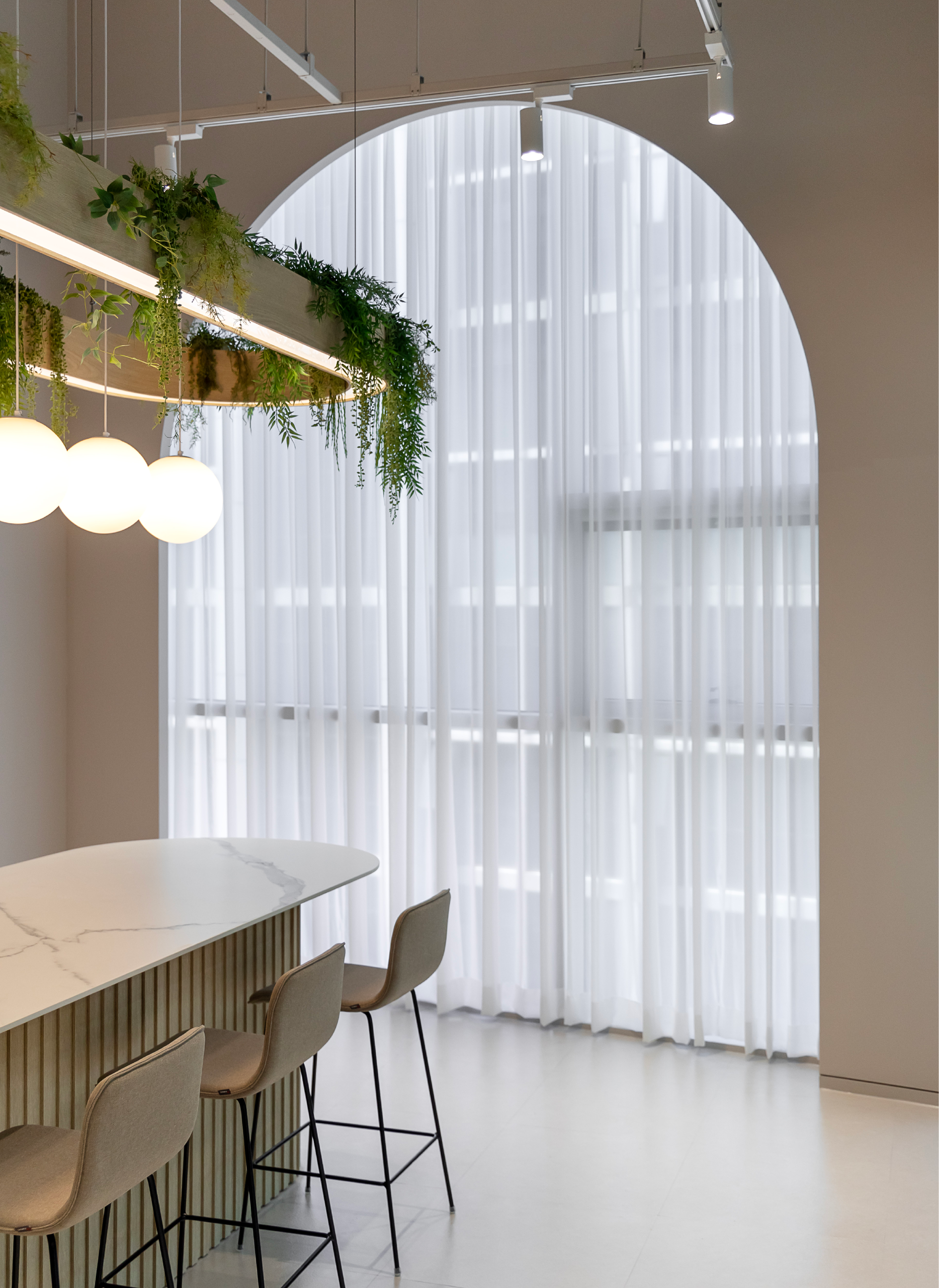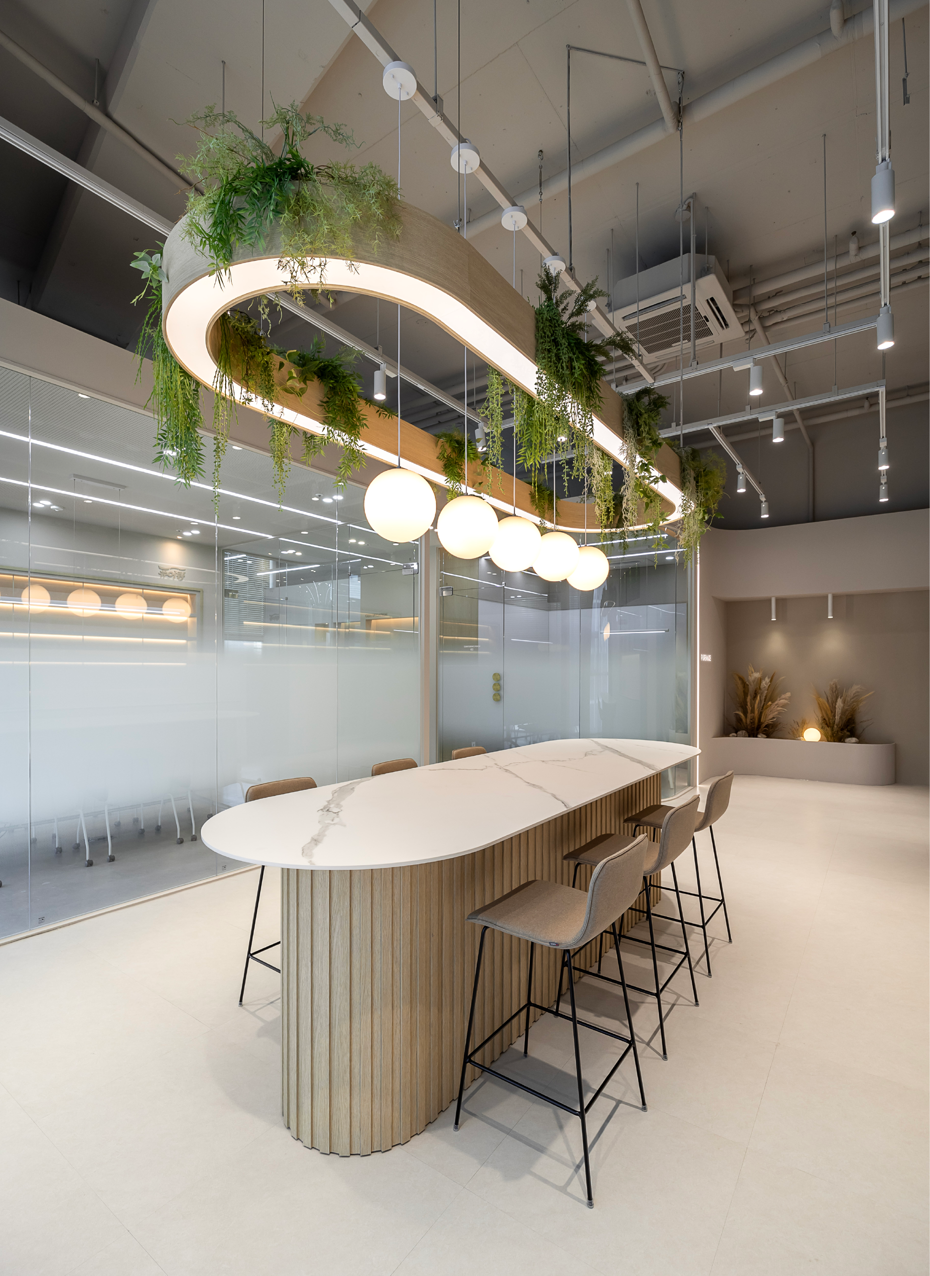 행잉플랜트를 감각적으로 활용한 펜던트 조명과 바테이블은 같은 곡률을 적용해 형태적 완성도를 높였습니다.