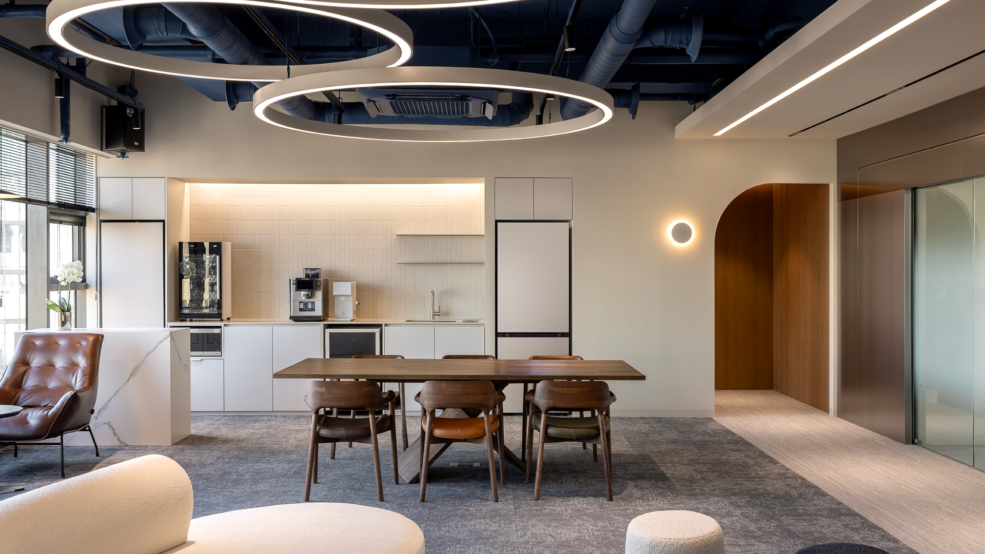 동시에 '난청인들을 위한 음성 솔루션 기업'이라는 가치를 드러낼 수 있도록, 소리의 파동에서 형태적인 모티브를 따온 원형 펜던트 조명으로 라운지 공간의 포인트를 주었습니다.