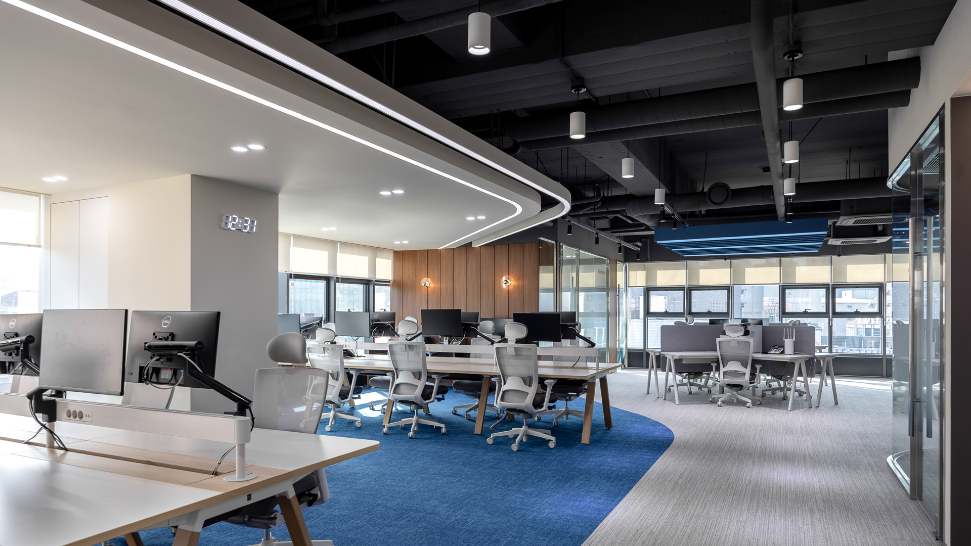 핫데스크 존은 블루 포인트 컬러와 라인조명으로 다른 공간과 차별되는 느낌을 부여, 직원들이 업무 환경을 다양하게 전환해가며 업무 능률을 올릴 수 있는 공간 솔루션을 제안했습니다.