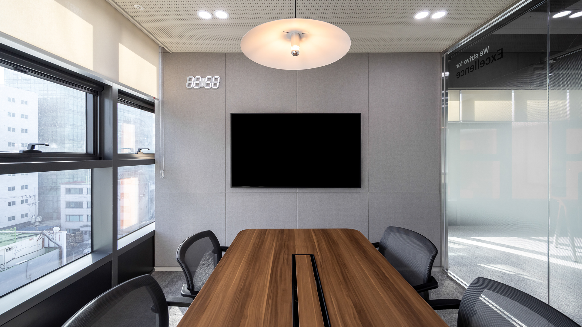 대표이사실은 전체적인 사무공간의 디자인 컨셉을 유지하면서, 간단한 미팅과 VIP 접객이 가능하도록 미팅 테이블, 화이트보드, 디스플레이 모니터를 적용했습니다.
