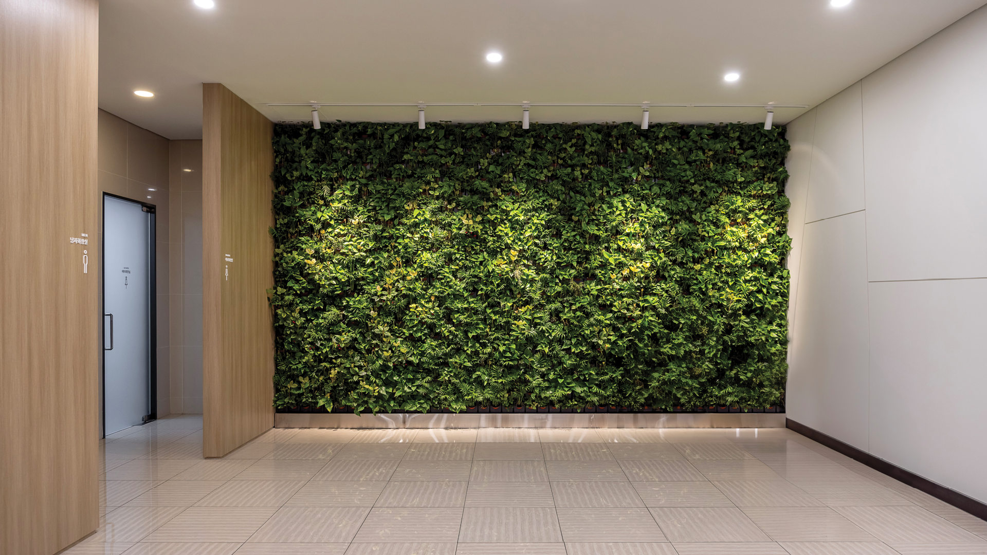 심플한 느낌으로 구성된 오피스 공간이 생기있고 삭막하지 않도록 생화로 구성된 플랜트월을 조성했습니다.
