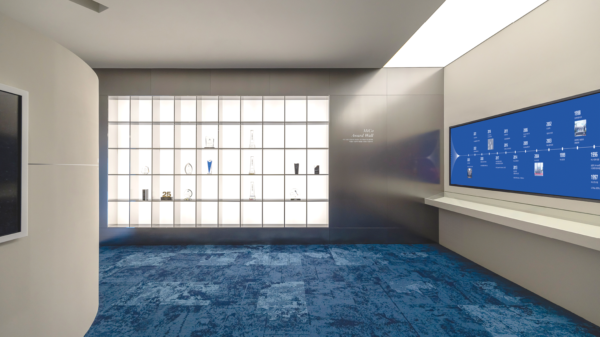 트로피를 전시해둘 수 있는 디스플레이 장은 바리솔 조명을 도입해 하이테크적인 느낌을 주는 요소로 활용했습니다. 또한 고정된 방식의 전시 그래픽이 아닌, 터치형 디스플레이를 활용해, 전시 컨텐츠의 관리와 업데이트가 쉽도록 했습니다.