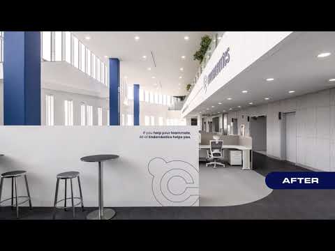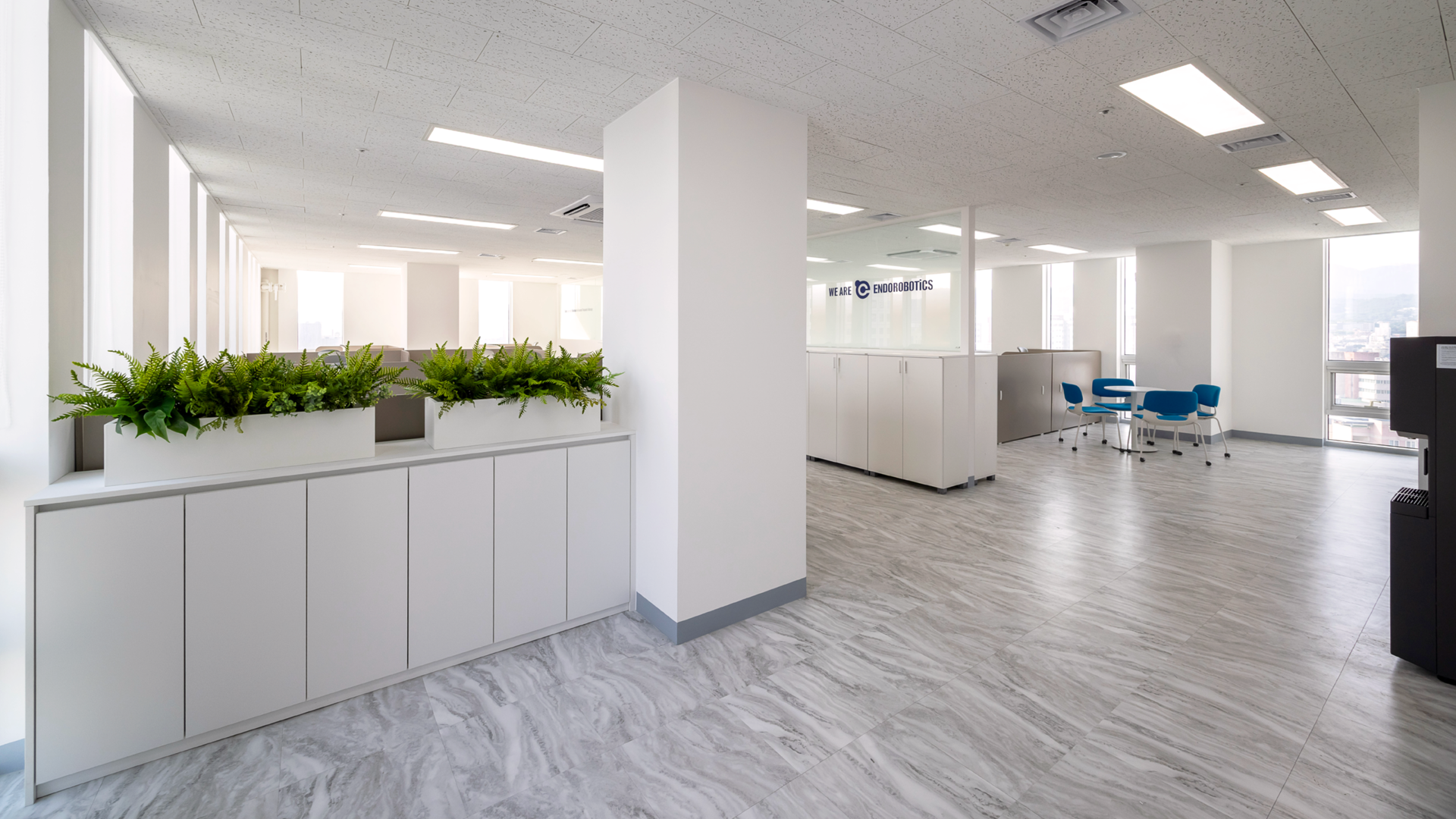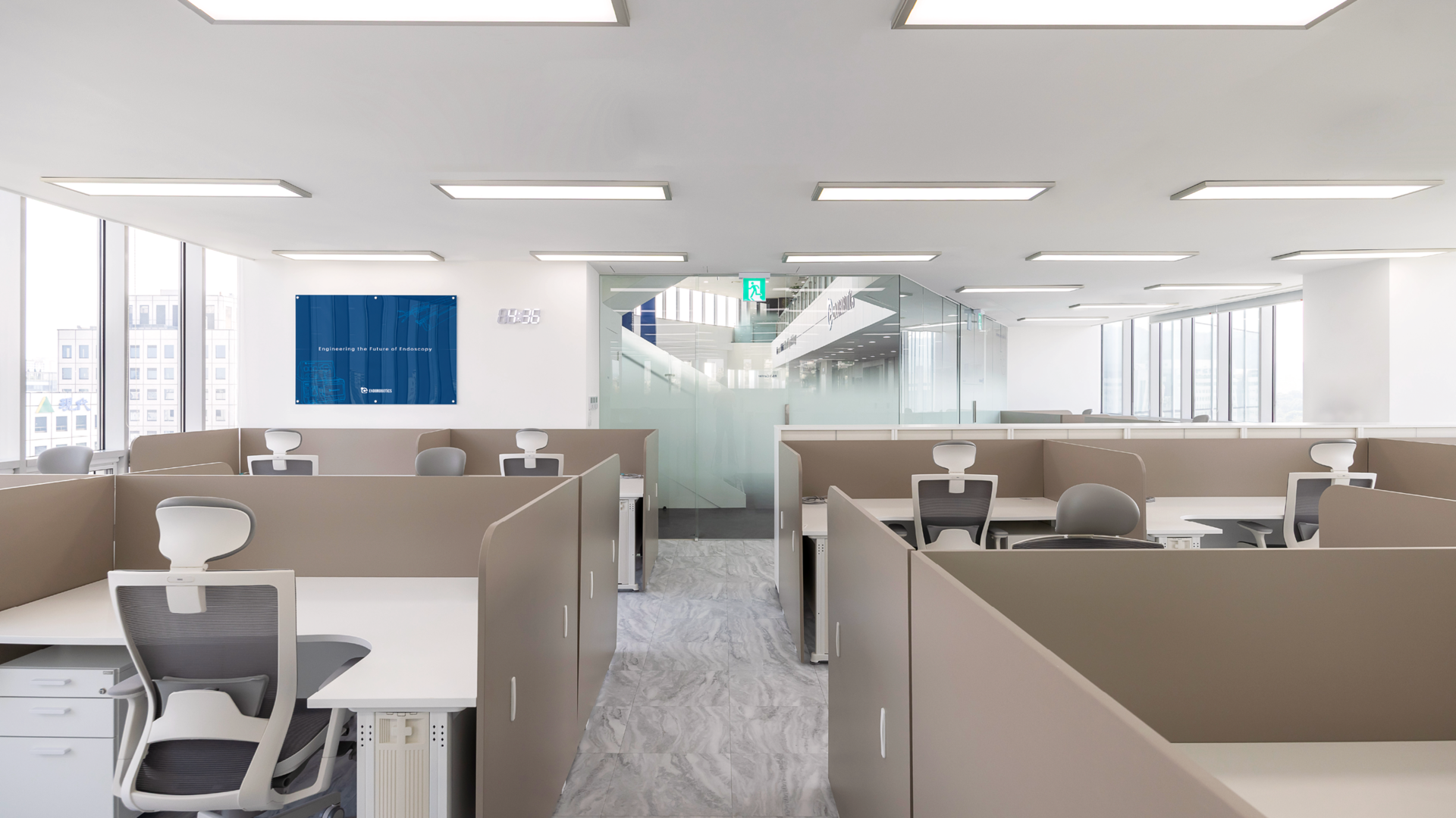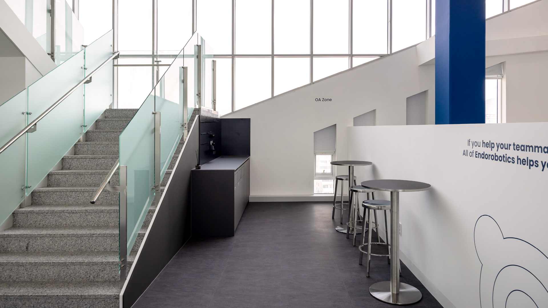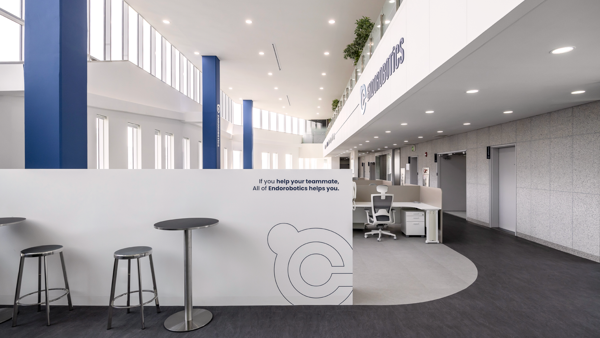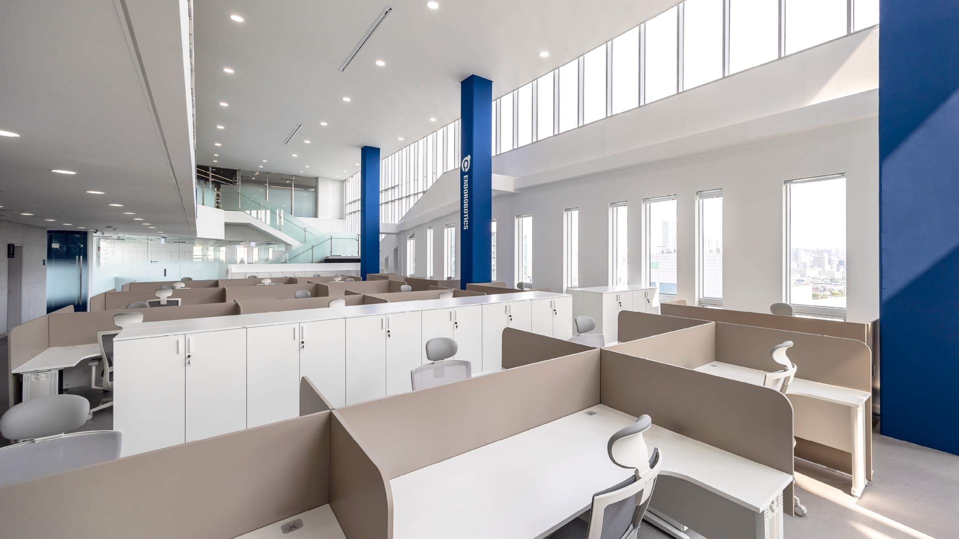 기둥에는 엔도로보틱스의 CI 컬러에서 모티브를 가져온 블루 컬러를 포인트로 활용해, 자칫 밋밋해 보일 수 있는 넓은 공간에 리듬감과 기업 아이덴티티를 부여했습니다.