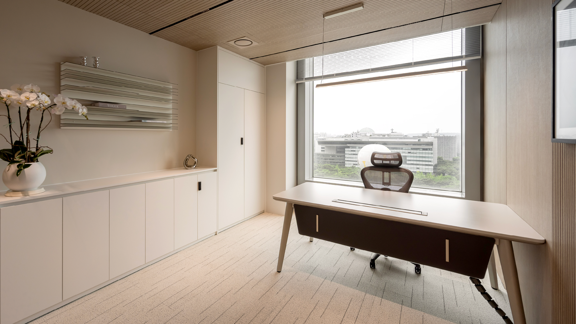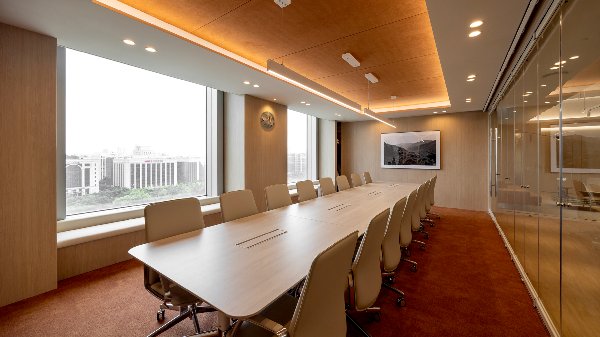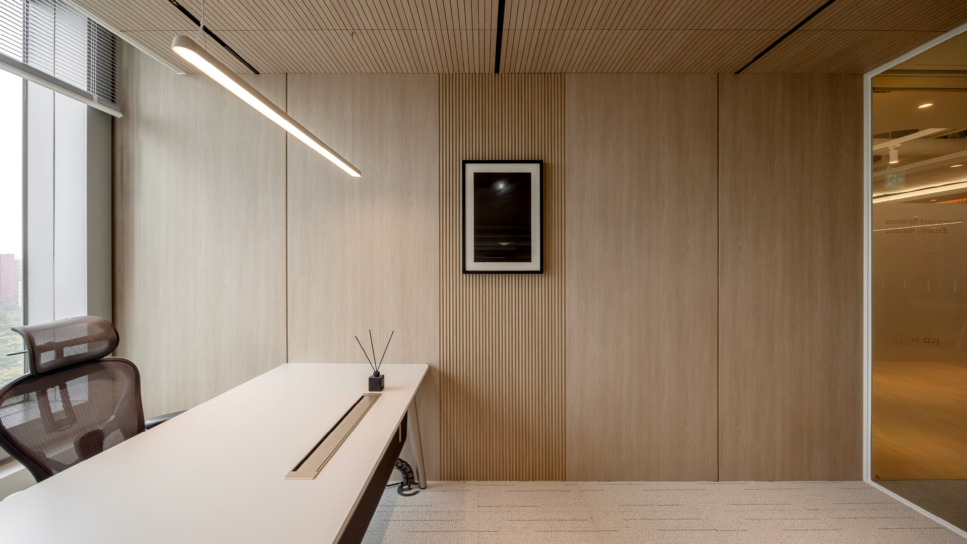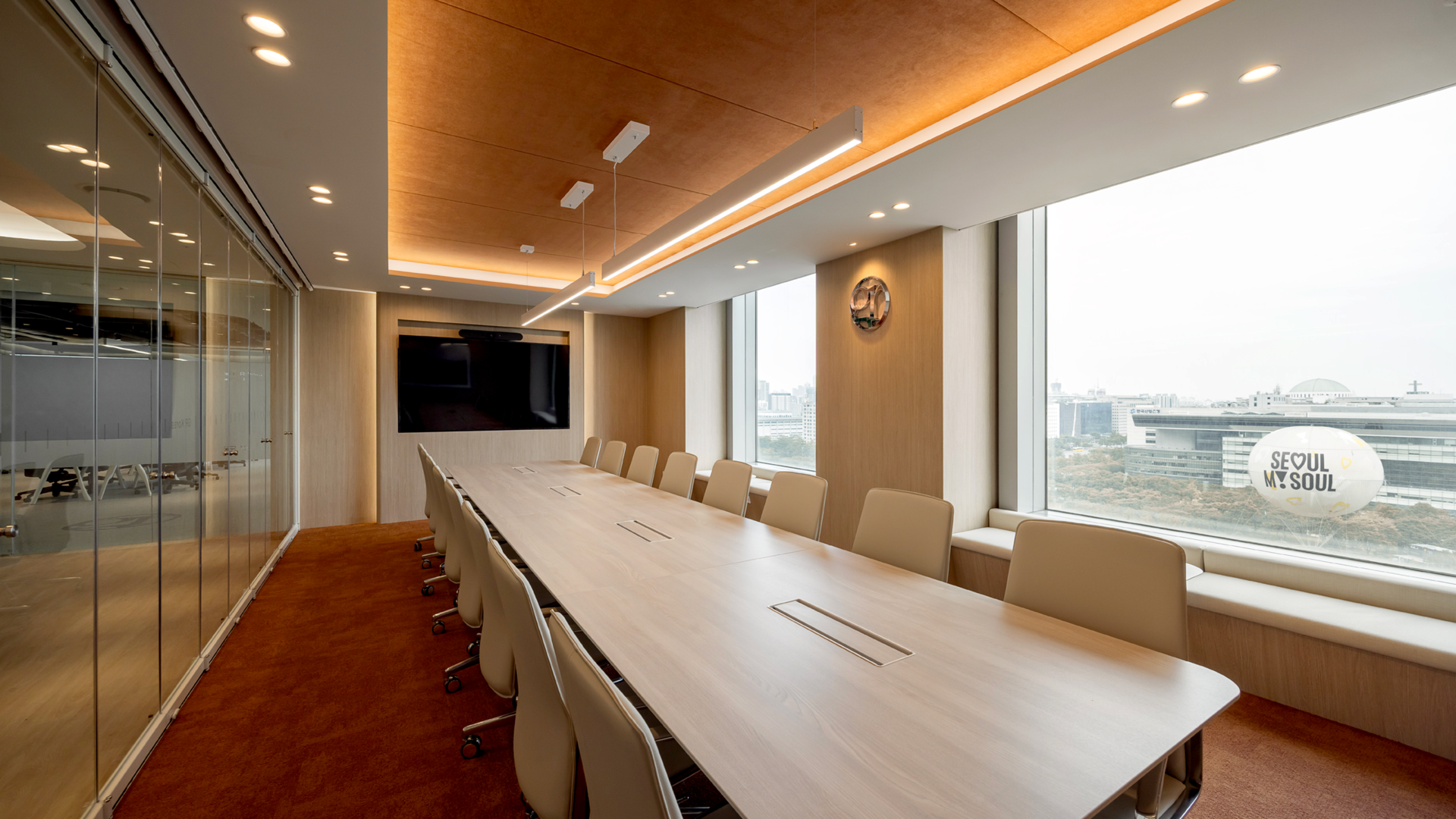 세련된 텍스쳐감의 아이보리 컬러 카펫타일과 우드톤으로 마감한 템바보드, 모던한 느낌의 아트워크가 어우러져, 대표이사실에 어울리는 고급스러운 분위기의 공간으로 연출했습니다.