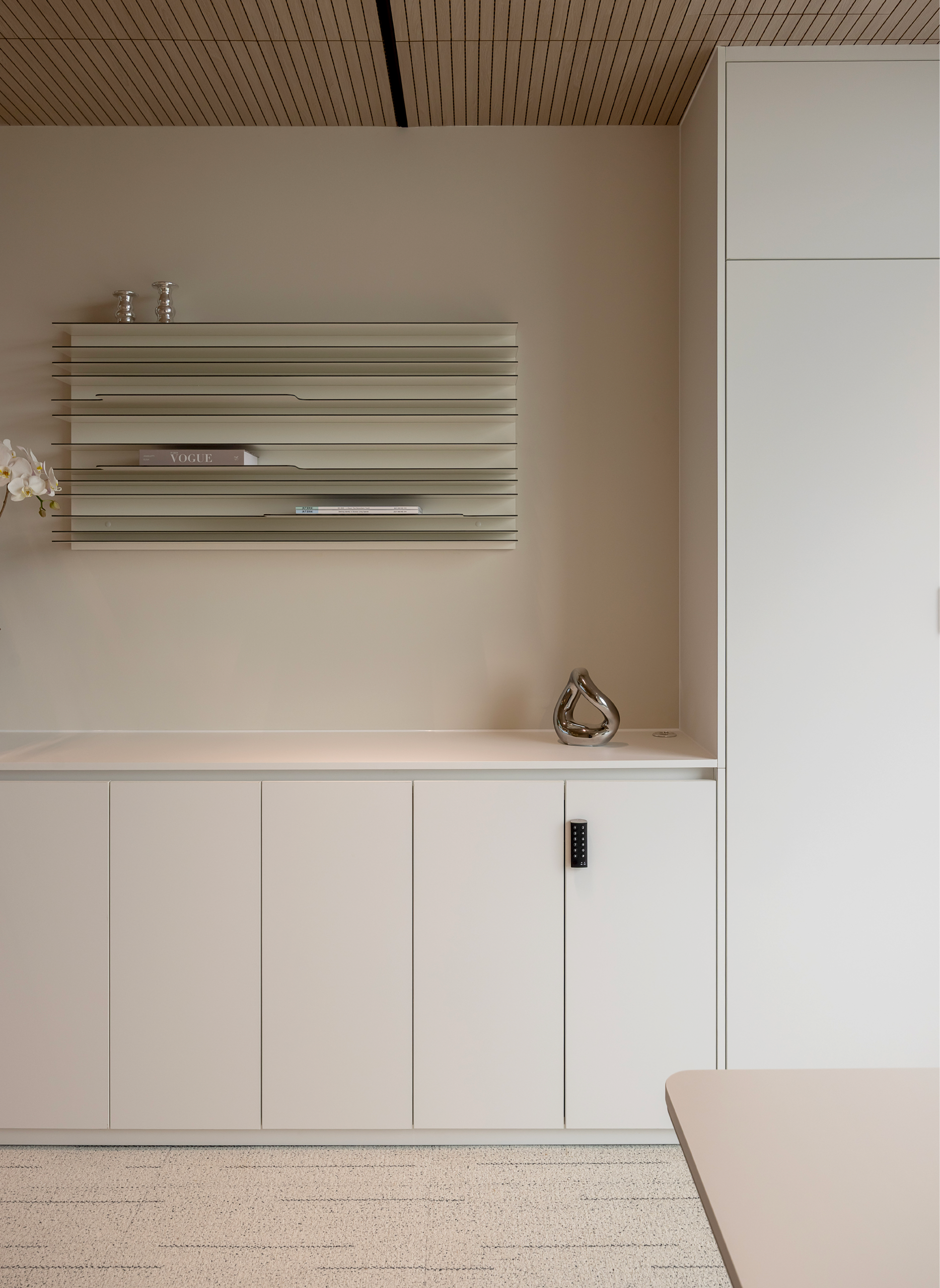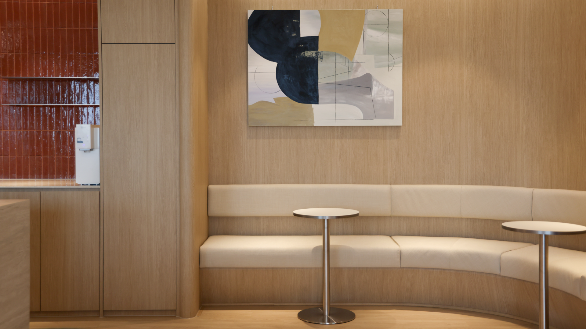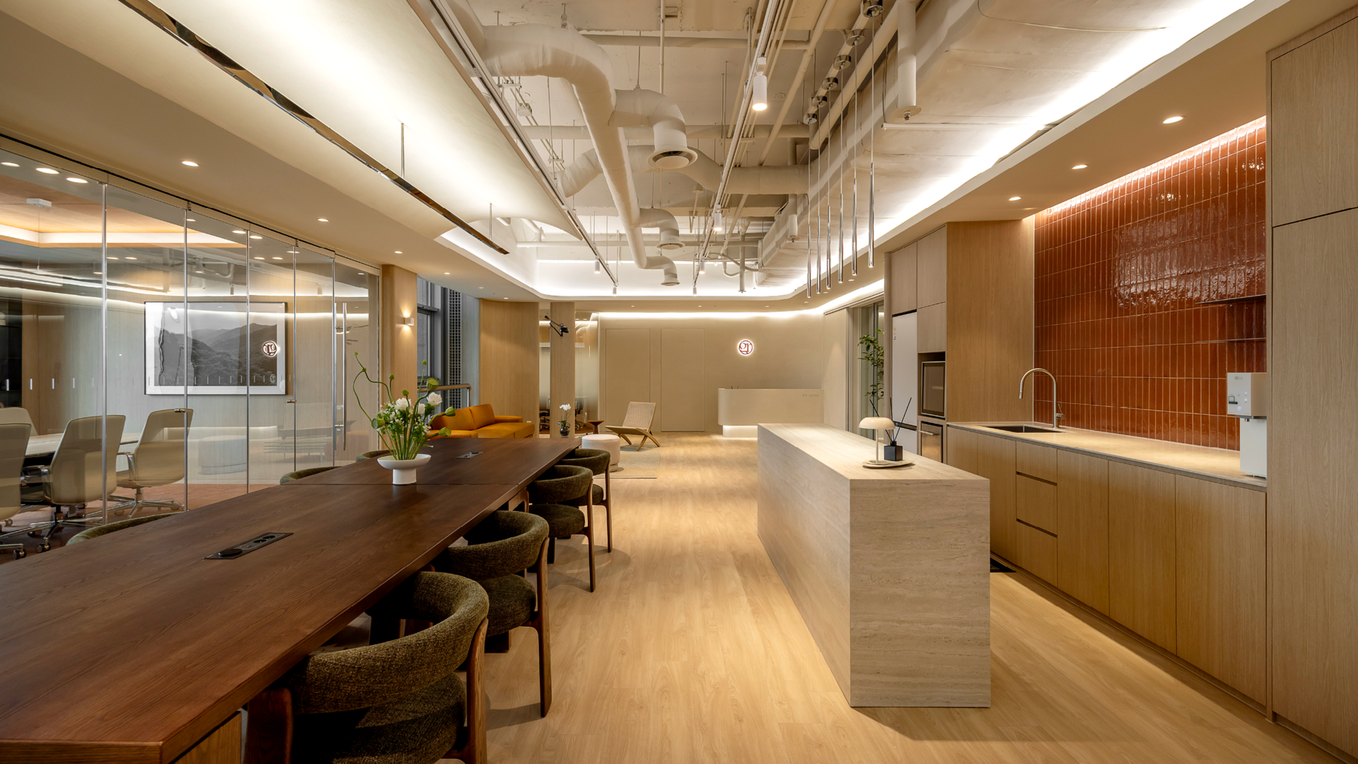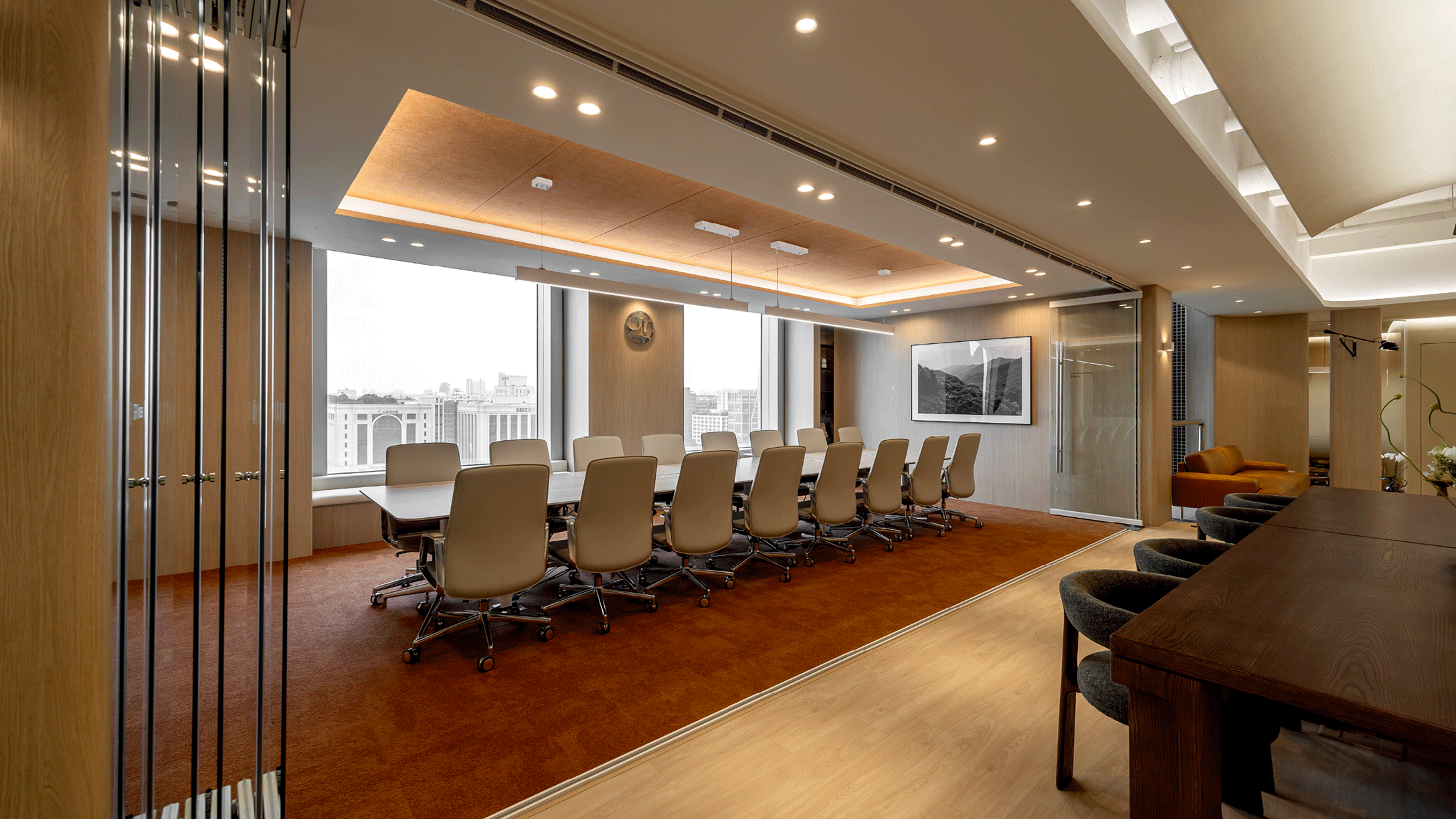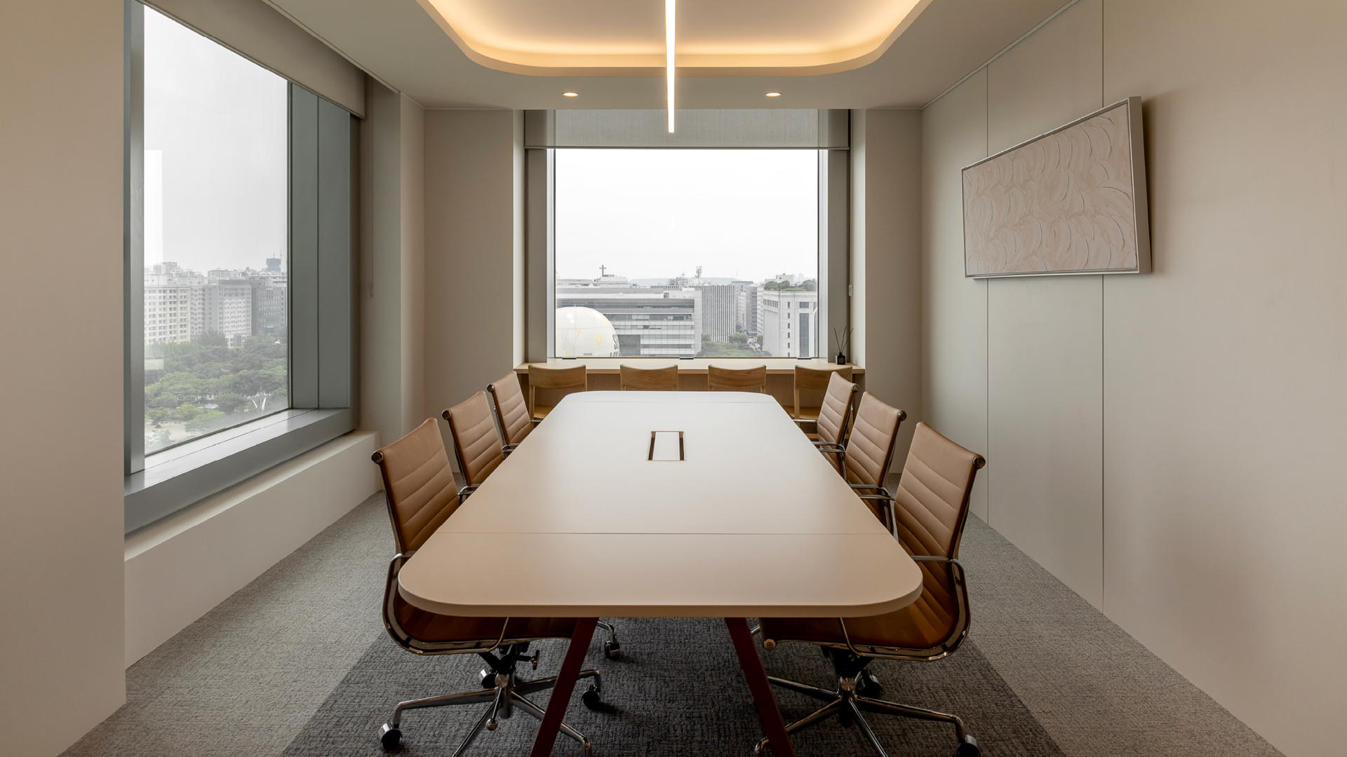 세련된 텍스쳐감의 아이보리 컬러 카펫타일과 우드톤으로 마감한 템바보드, 모던한 느낌의 아트워크가 어우러져, 대표이사실에 어울리는 고급스러운 분위기의 공간으로 연출했습니다.