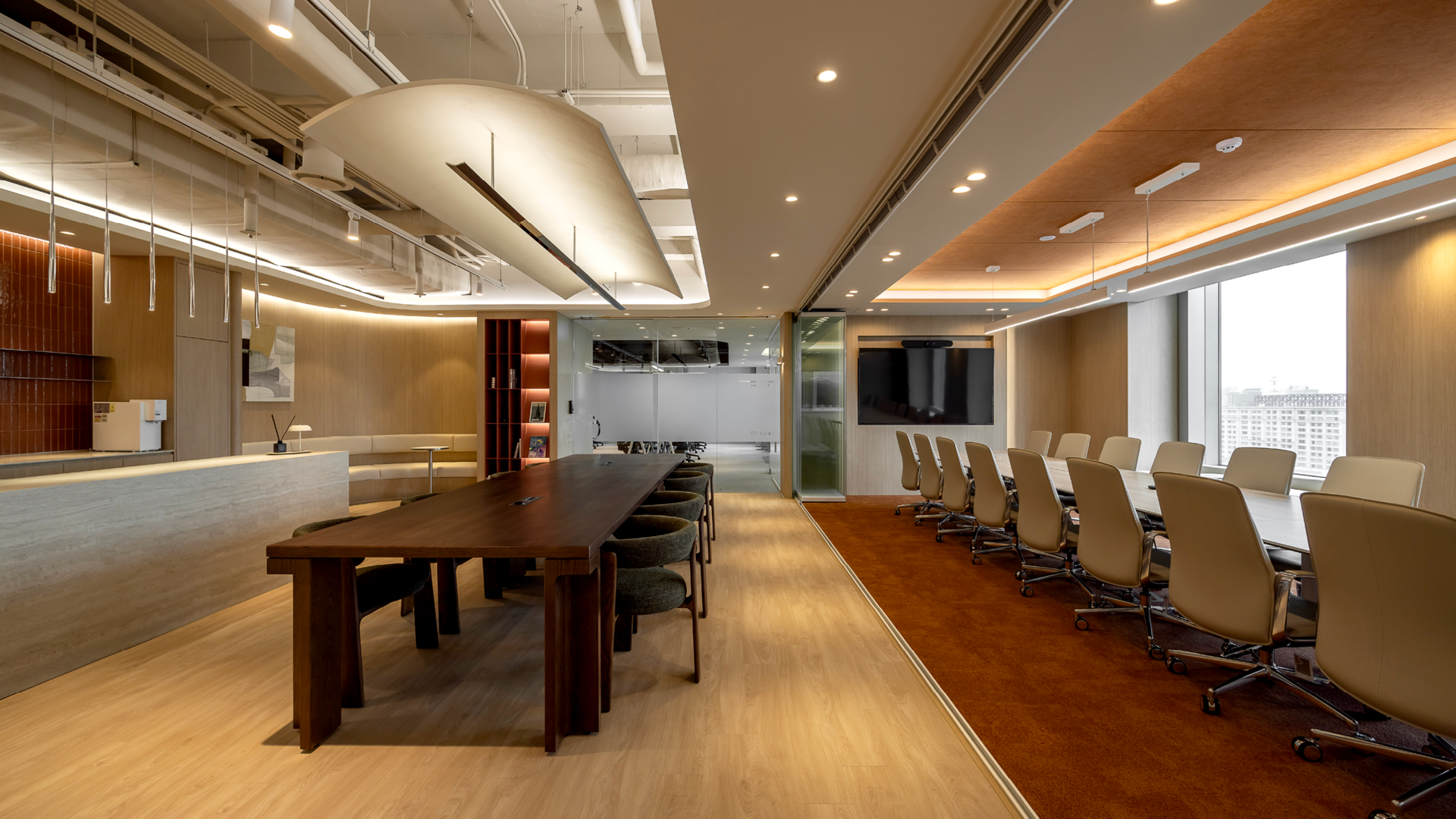 유리 폴딩도어를 적용해, 내부의 중요한 미팅이나 외부 인원을 초대한 행사 등 다양한 용도로 활용이 가능한 대회의실입니다.