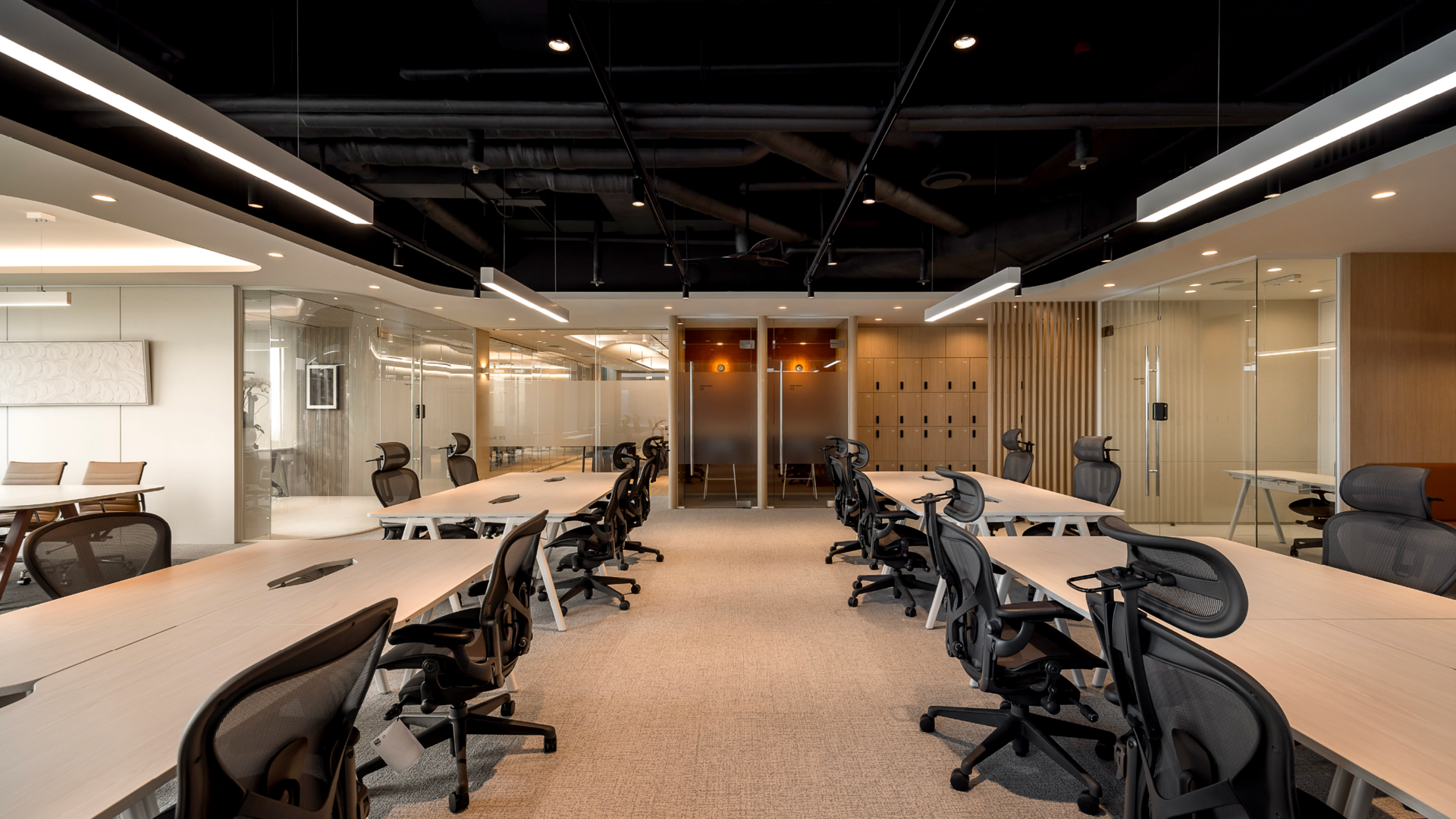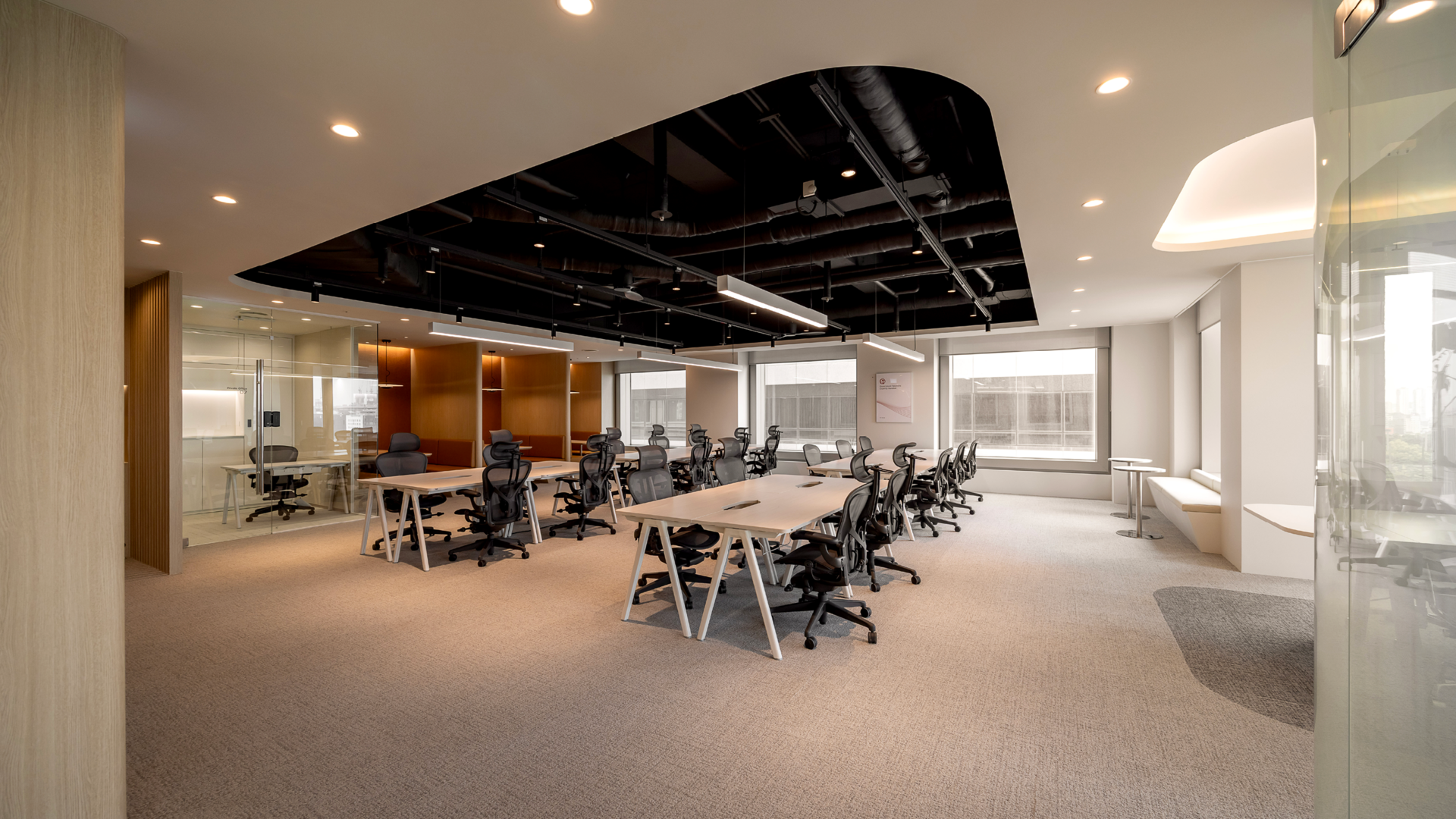 고급스럽고 쾌적한 분위기의 사무공간입니다. 외국계 기업 오피스에서 자주 사용하는 카펫타일로 전체 바닥을 구성했으며, 공간에 따라 카펫타일의 톤을 다르게 적용해 자연스럽게 공간을 구분해주었습니다. 천정의 경우 부분적으로 노출 천정을 적용하되, 블랙에 가까운 짙은 컬러로 도장하여 깔끔한 느낌의 대비감이 느껴지는 세련된 분위기의 공간으로 연출했습니다.