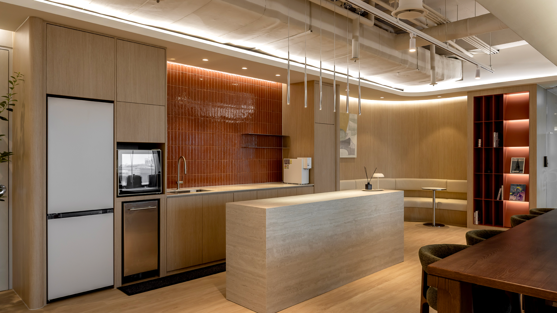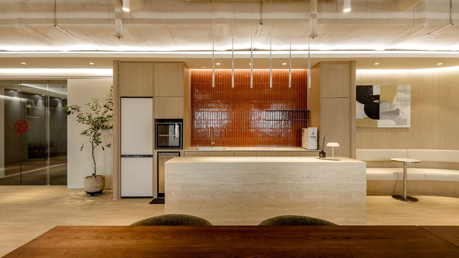 캔틴 벽면에 브릭 컬러의 고급스러운 타일과, 트래버틴 텍스쳐의 아일랜드 테이블을 적용하여 고급스러움을 강조한 공간으로 디자인했습니다.