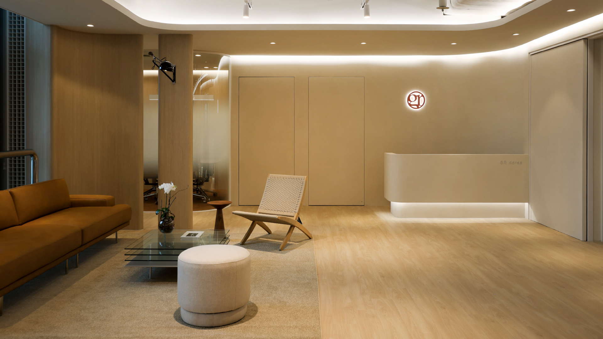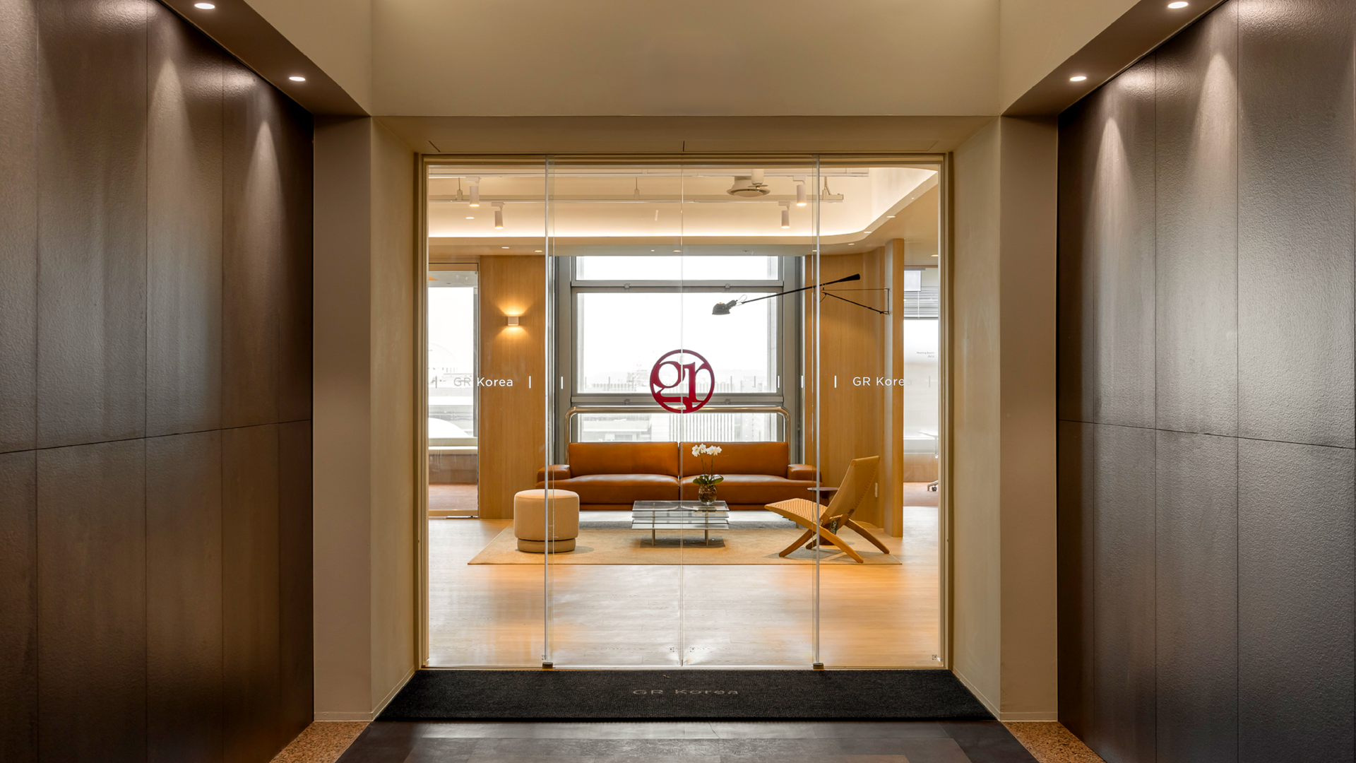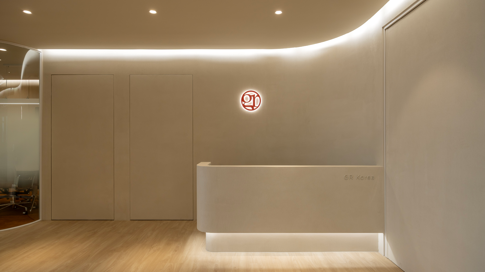 도어의 중앙에는 GR코리아의 원형 로고와 미니멀한 그래픽을 적용하여 방문객들이 직관적으로 GR코리아의 오피스임을 알 수 있도록 했습니다.