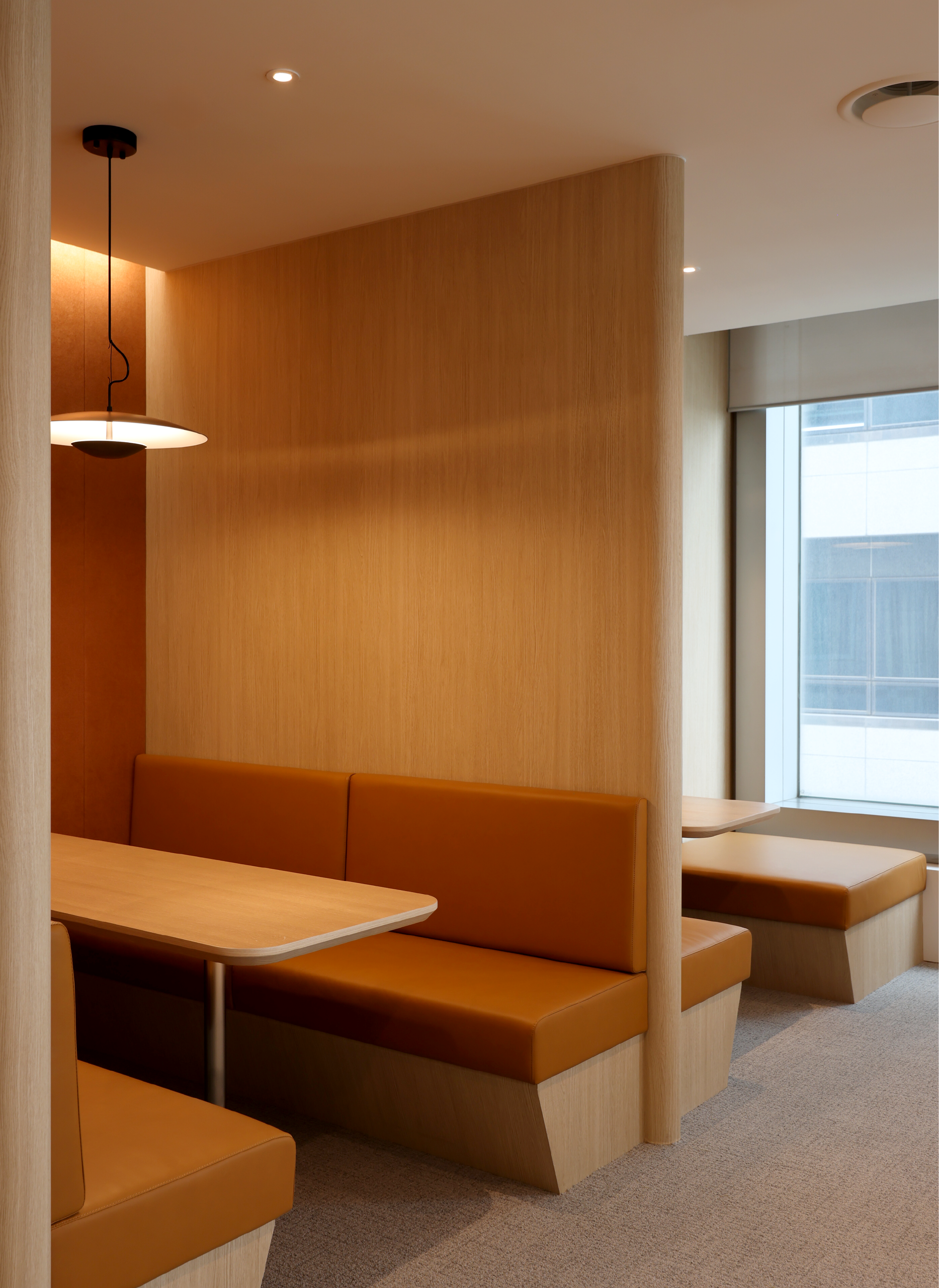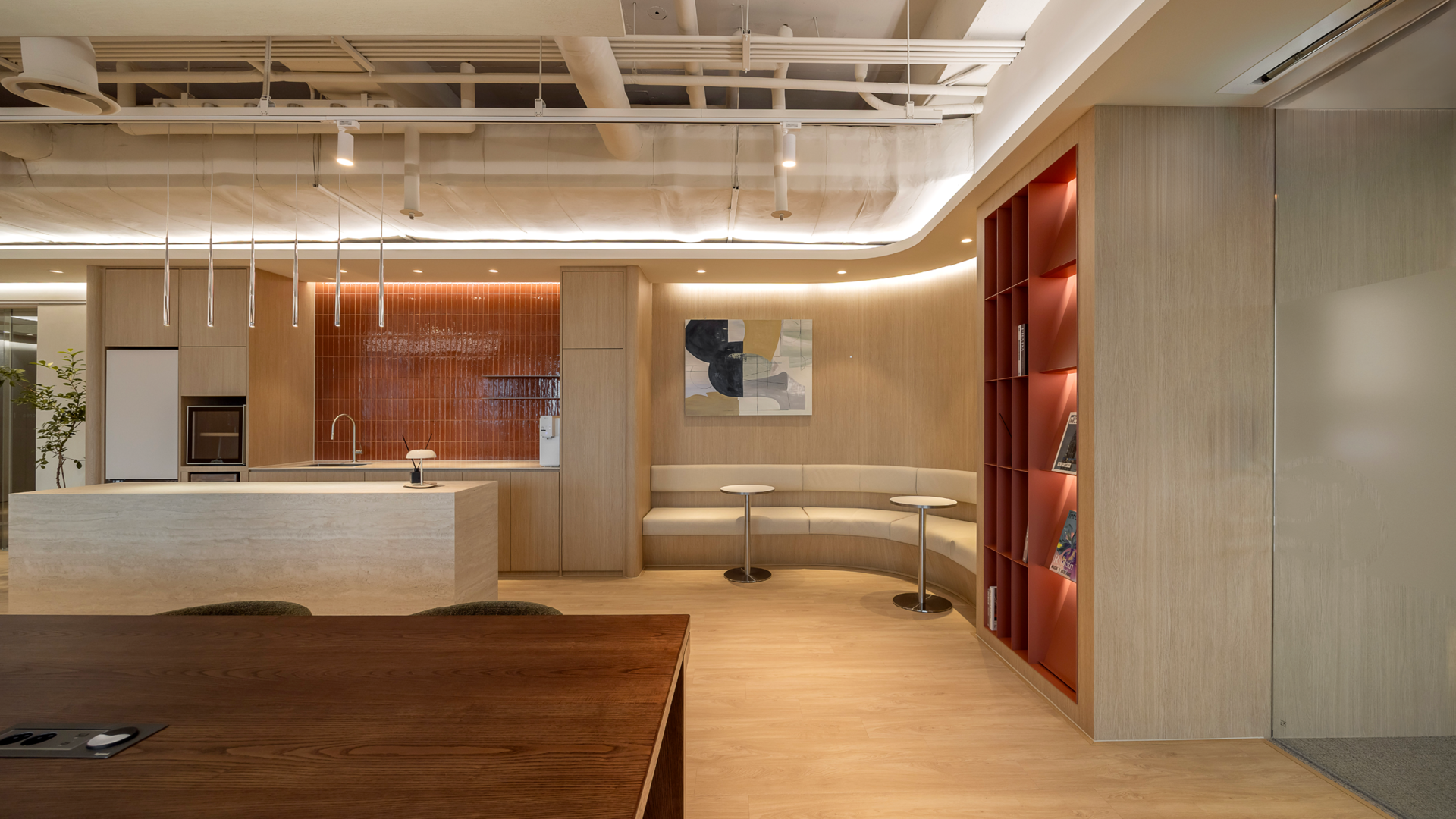또한, 캐노피 타입의 팬던트 조명이 중앙의 테이블과 함께 어우러져 라운지 공간의 시각적 중심을 잡아줄 수 있도록 설계했습니다.