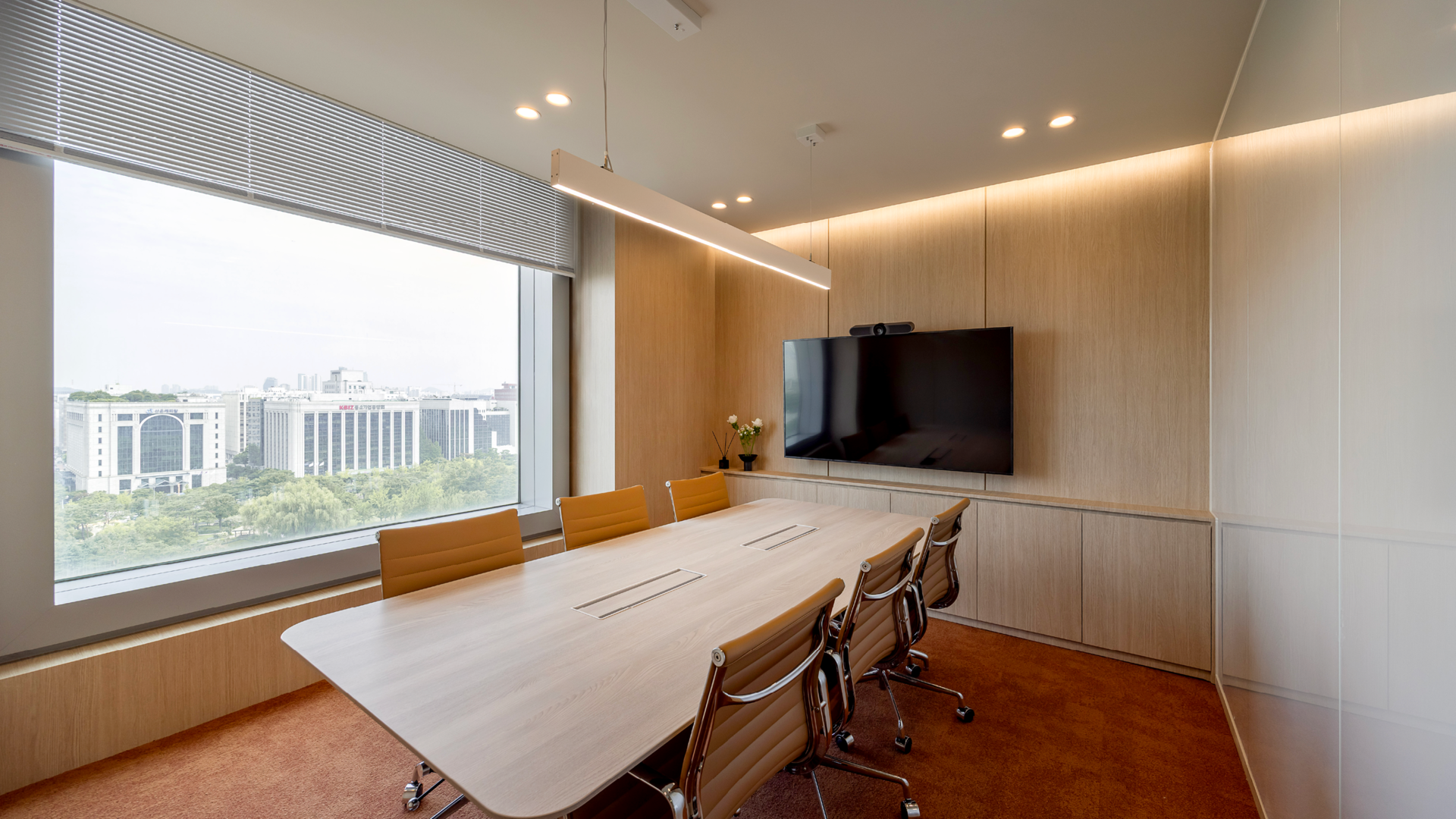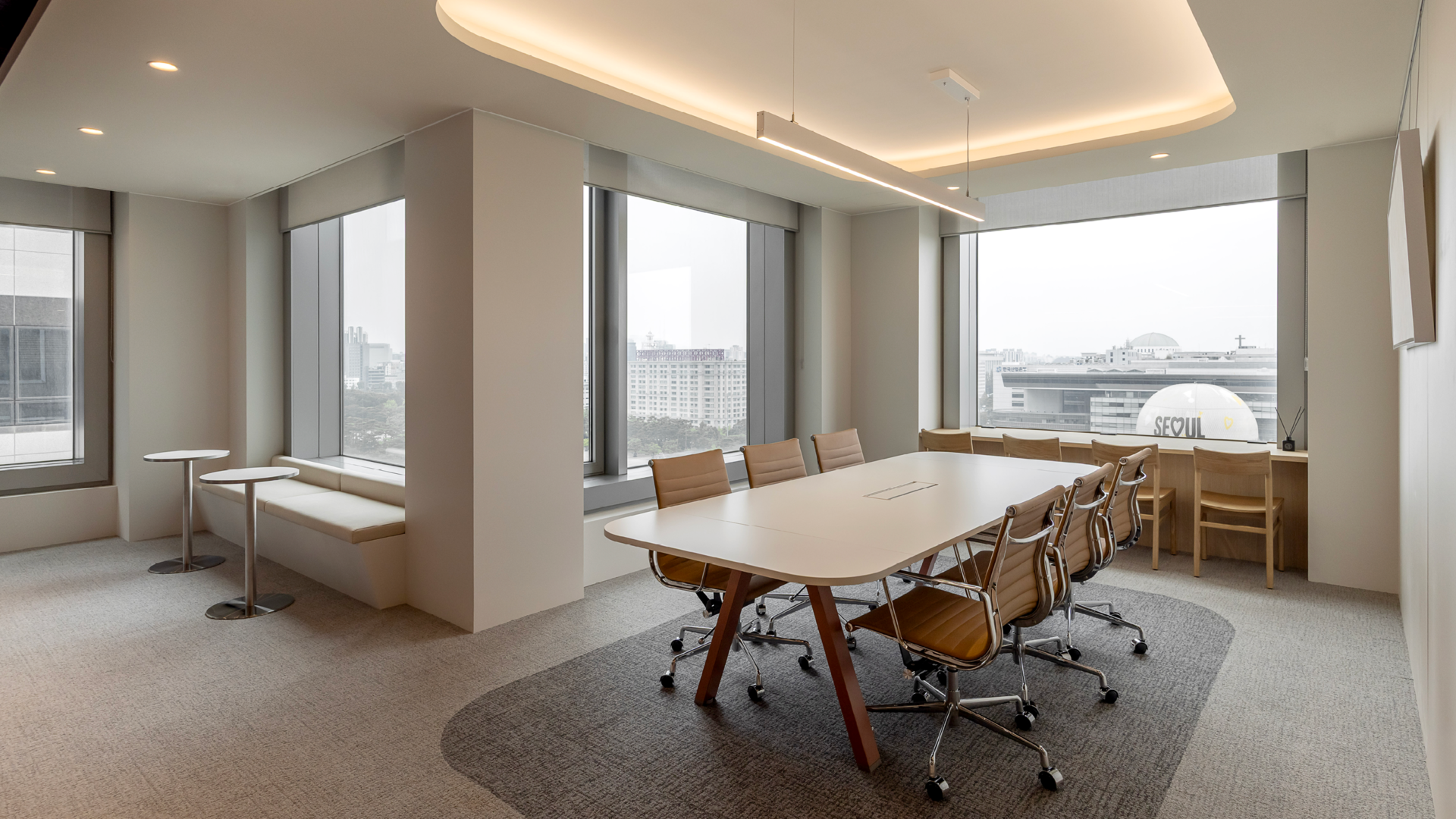 대회의실에 적용된 디자인 톤&매너를 유지하면서 조금 더 간결하고 실용적인 느낌의 회의공간으로 디자인했습니다.